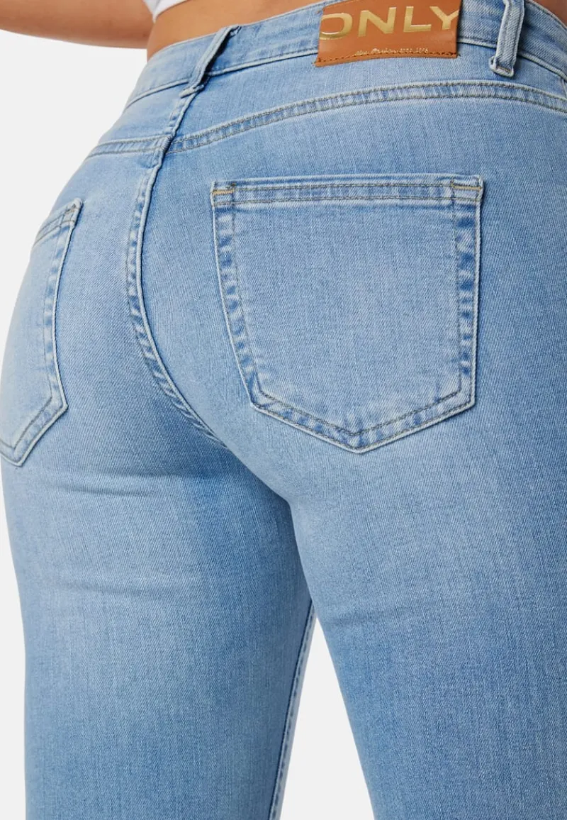 – Tett passform med utsvingte bein.